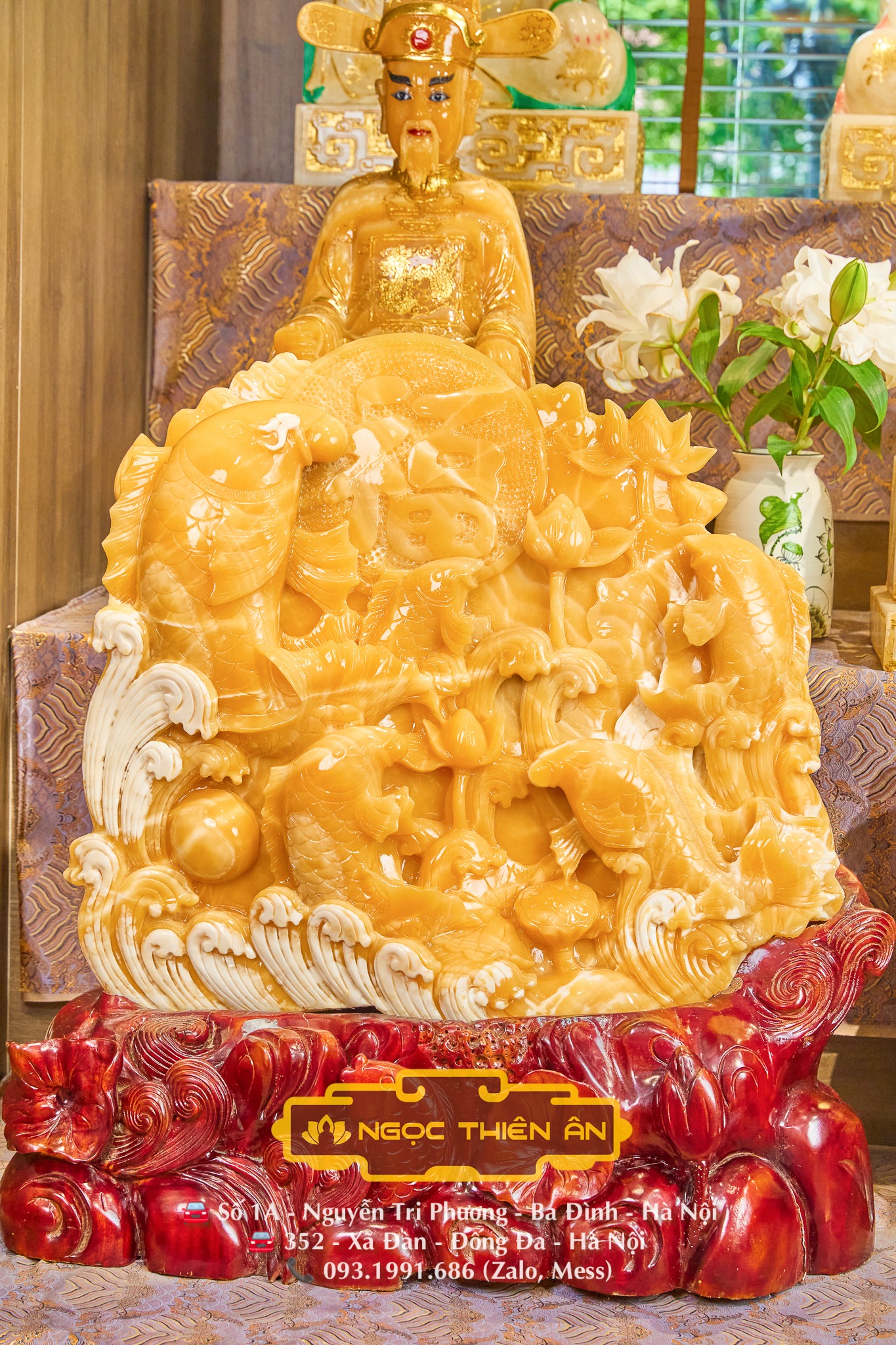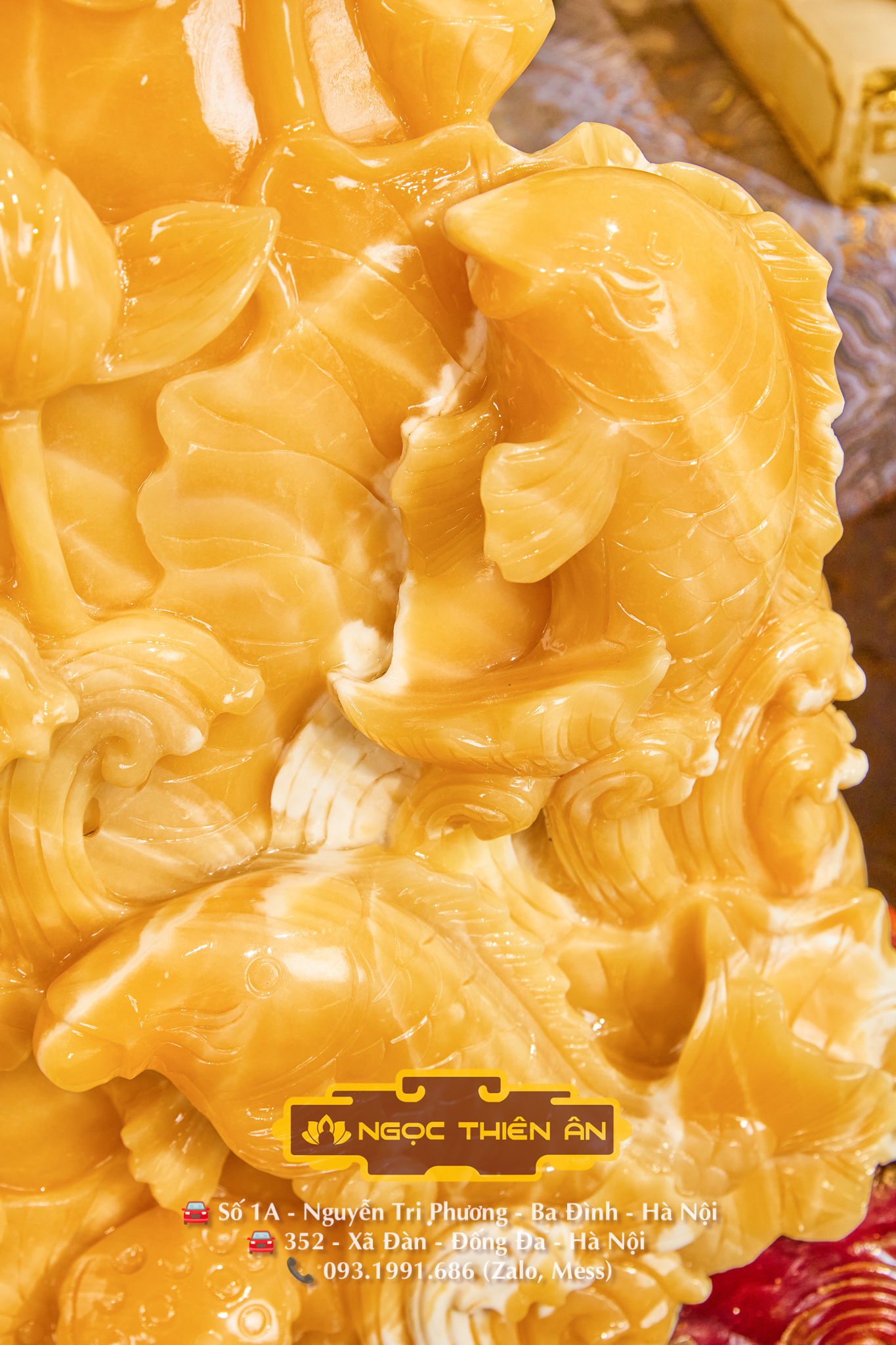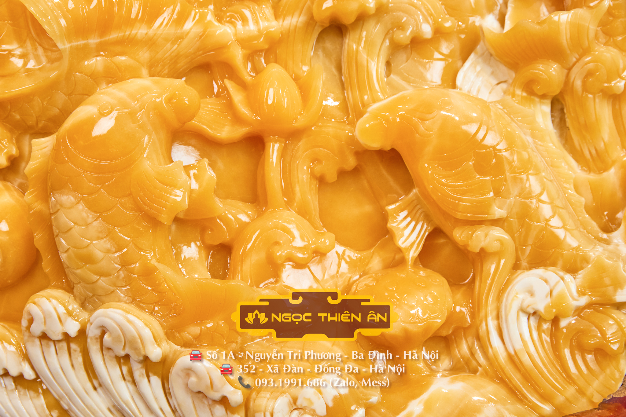𝐂𝐡𝐞́𝐩 𝐕𝐚̀𝐧𝐠 𝐧𝐠𝐚̣̂𝐦 𝐍𝐠𝐨̣𝐜 𝐛𝐞̂𝐧 𝐡𝐨̂̀ 𝐒𝐞𝐧 – Bức tạc từ Ngọc Hoàng Long nguyên khối mang lại sự giàu sang – phú quý với nhiều nét chạm đòi hỏi tay nghề & kinh nghiệm cao, làm lộ ra những đường vân đá theo tầng, theo lớp một cách tự nhiên và tinh tế nhất.  Trong Phong Thuỷ, hình tượng cá chép ngậm ngọc ngoài là biểu tượng của sự đủ đầy, giàu sang, sung túc… thì còn giúp gia chủ mở rộng đườn…